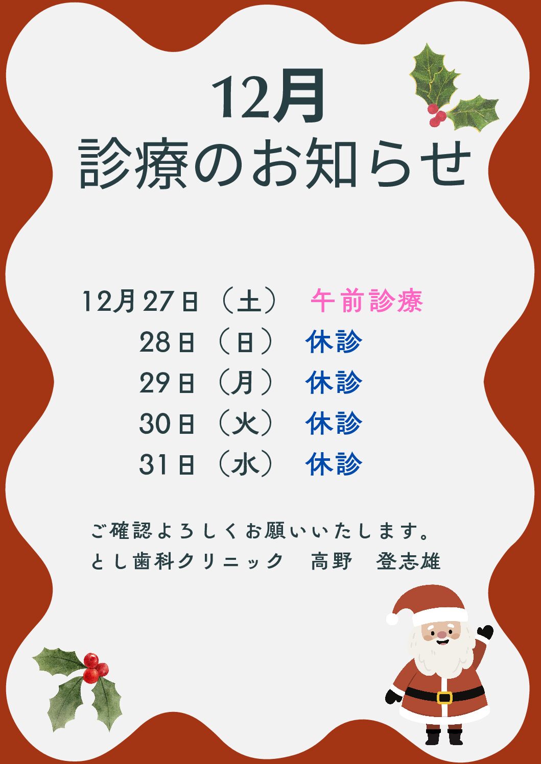 2025.11.25 その他 12月診療のお知らせ とし歯科クリニックです。早いもので今年もあとわずかになりました。 12月の診療のお知らせです。 ご確認をよろしくお願いいたします☺ 11月診療のご案内 記事一覧